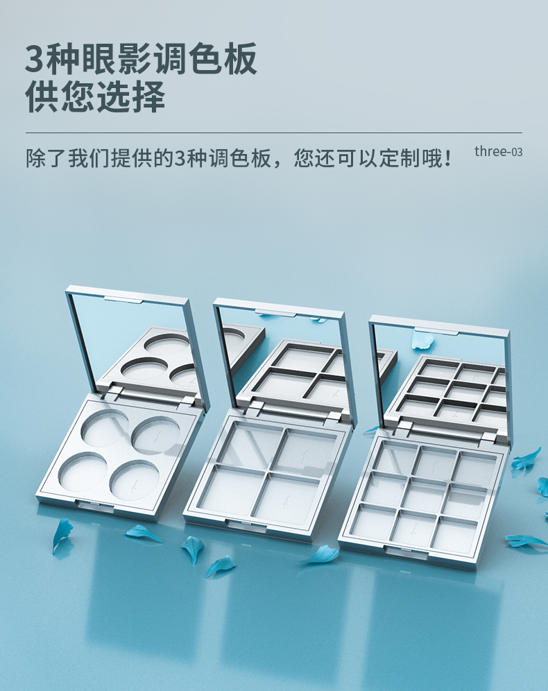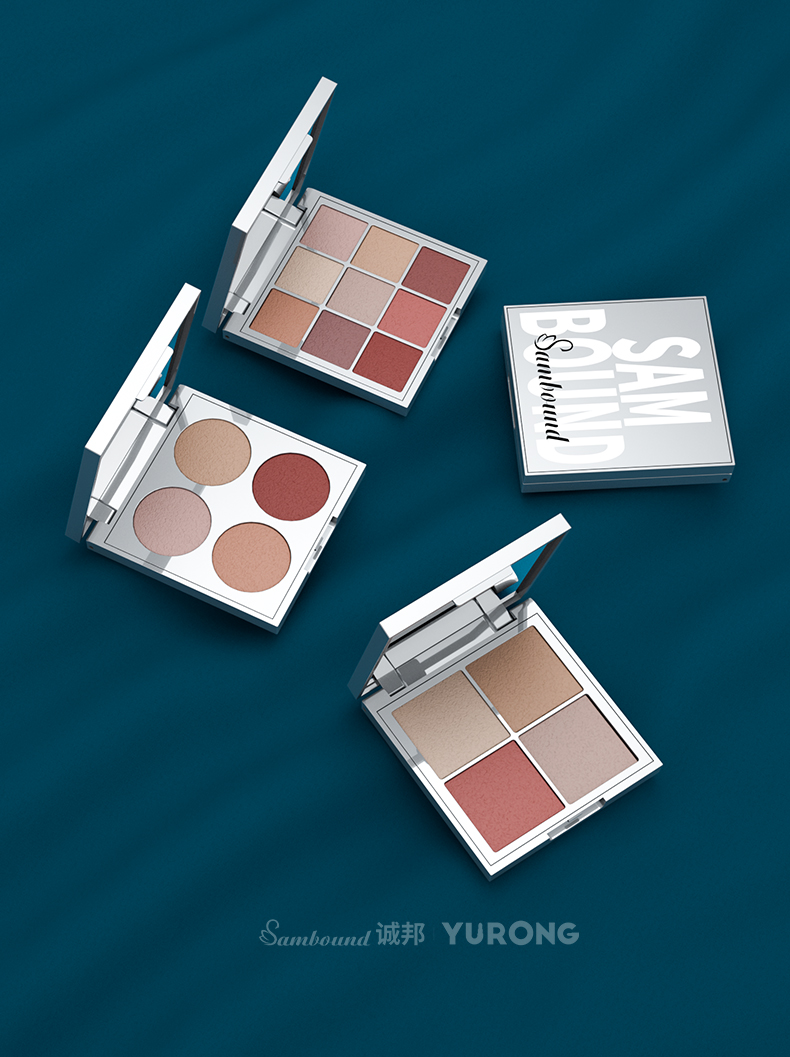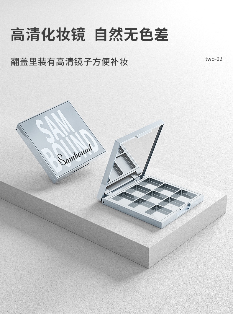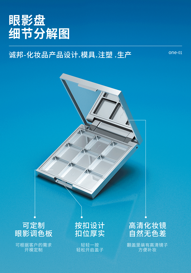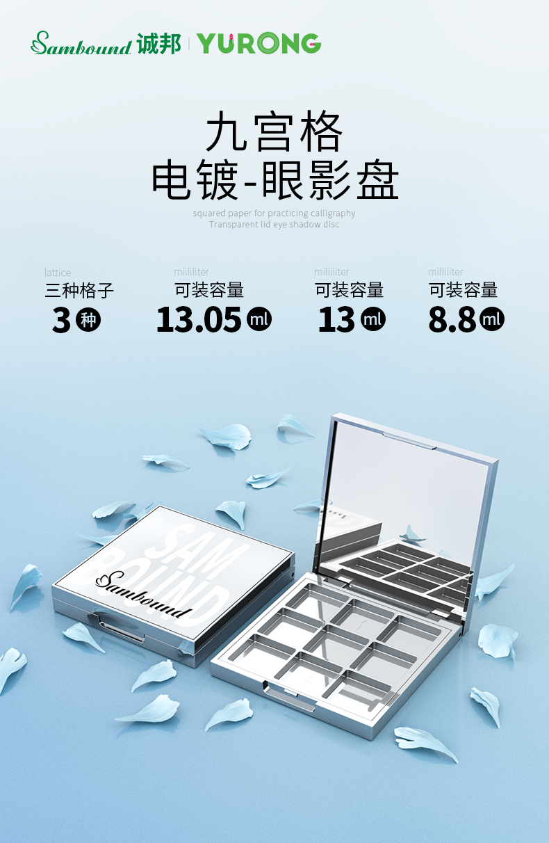 東莞誠(chéng)邦化妝品包材廠家定制的這款9宮格眼影盤采用銀色電鍍工藝,奢華有質(zhì)感,并且使用按扣開關(guān)設(shè)計(jì),方便操作??梢远ㄖ莆淖謑ogo