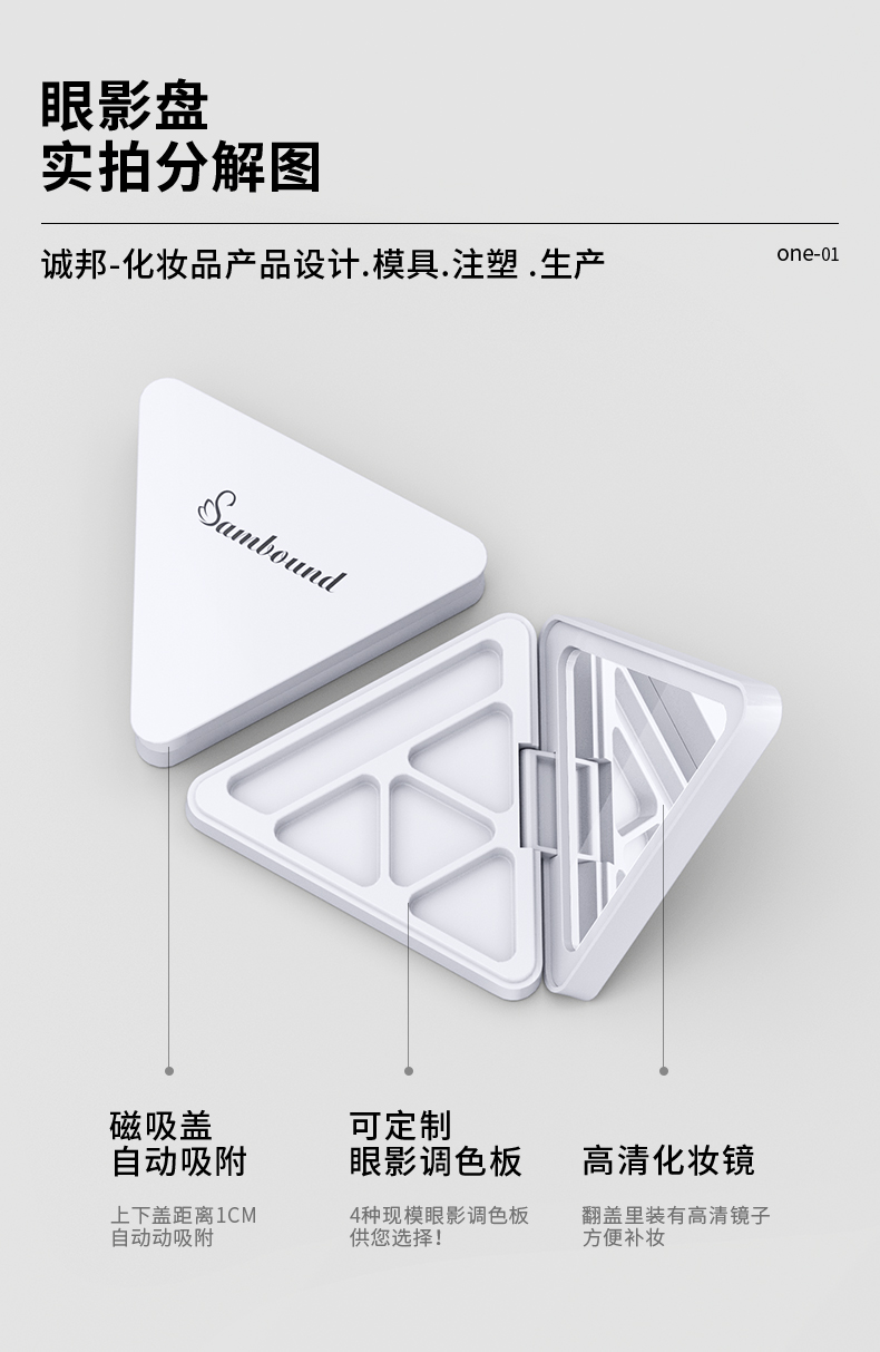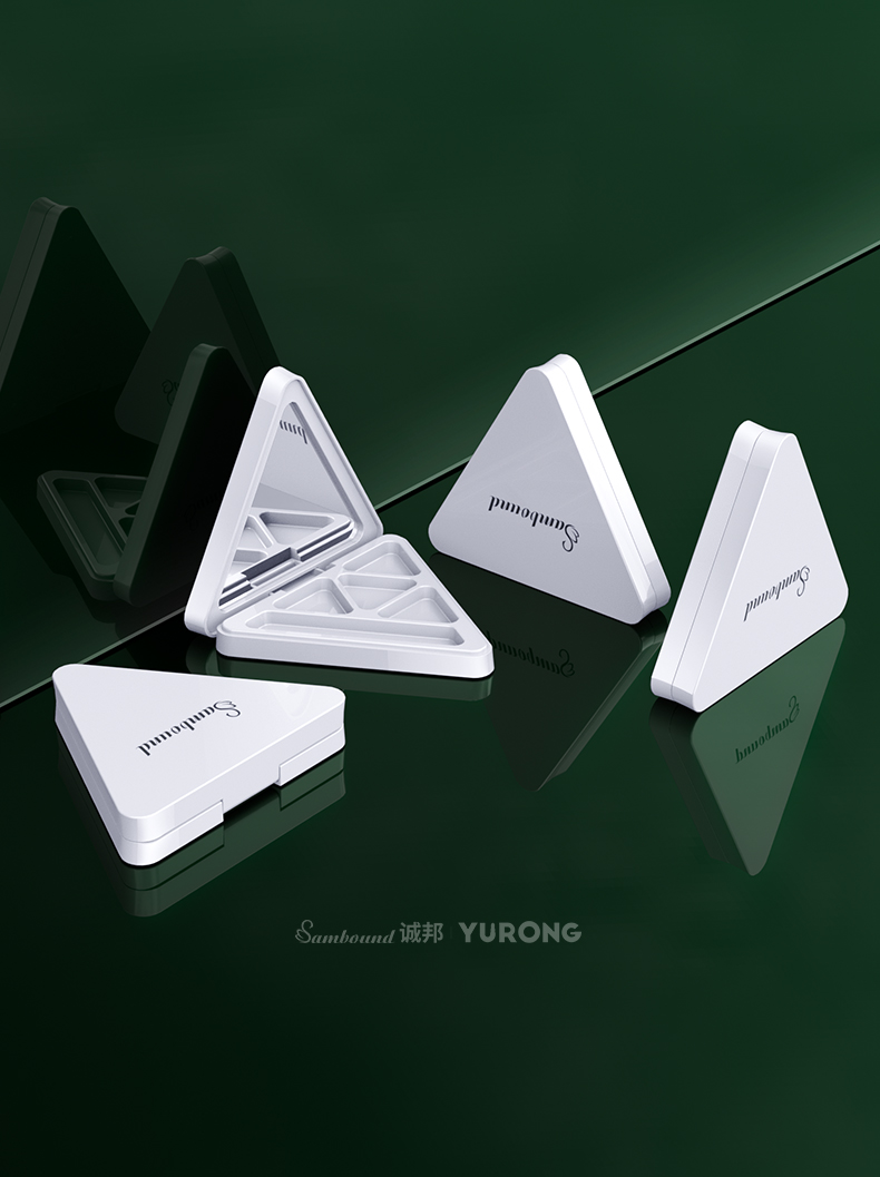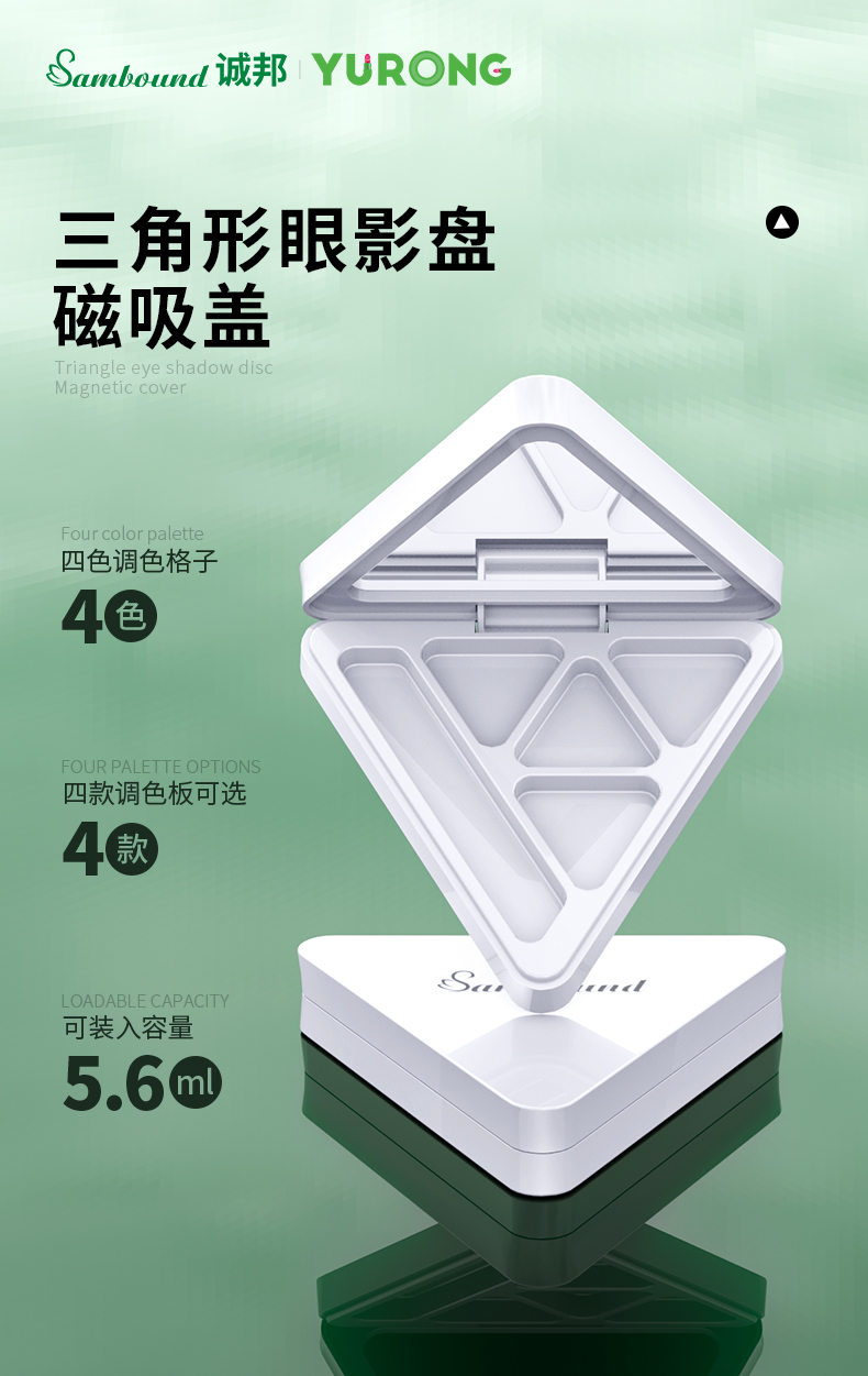 這款三角形磁吸眼影盤(pán)特點(diǎn):獨(dú)特的三角形外觀(guān)、磁吸開(kāi)關(guān)設(shè)計(jì)、可定制logo圖案