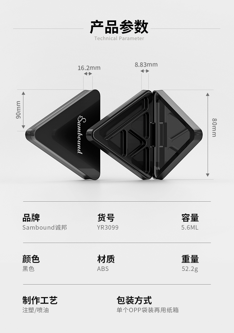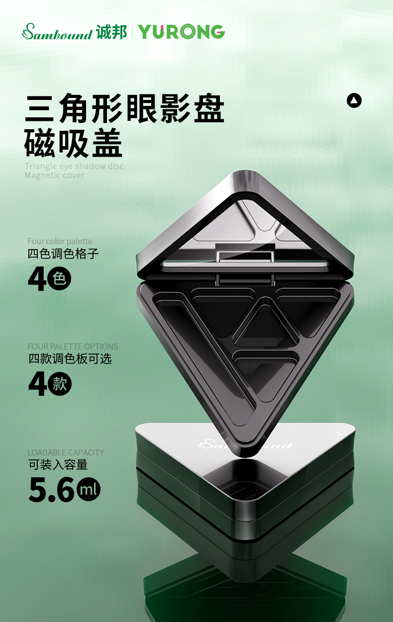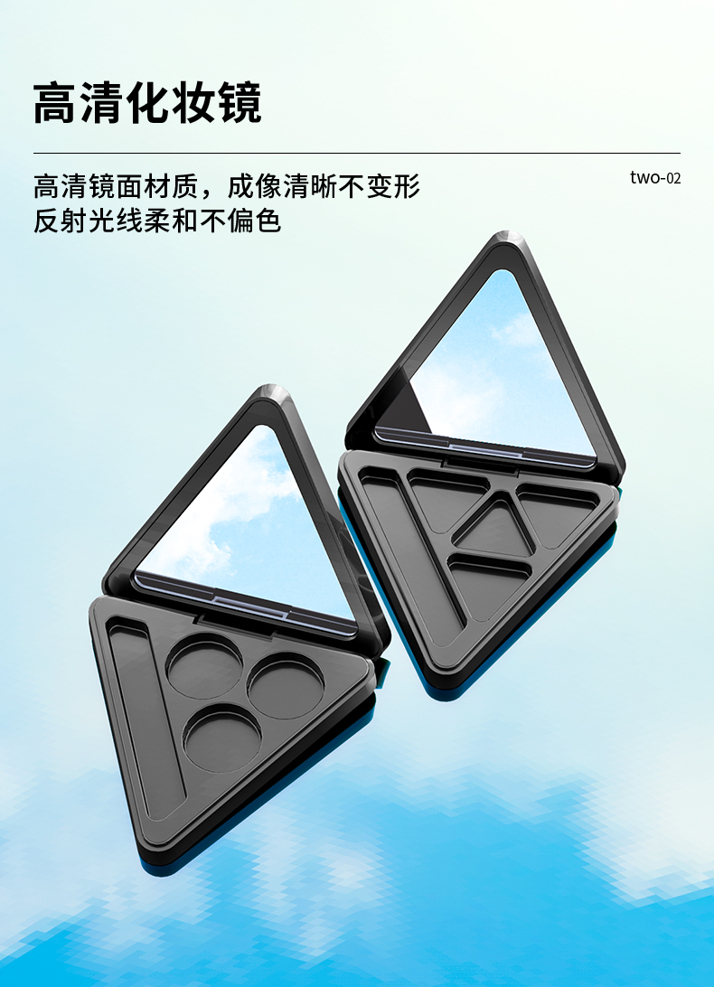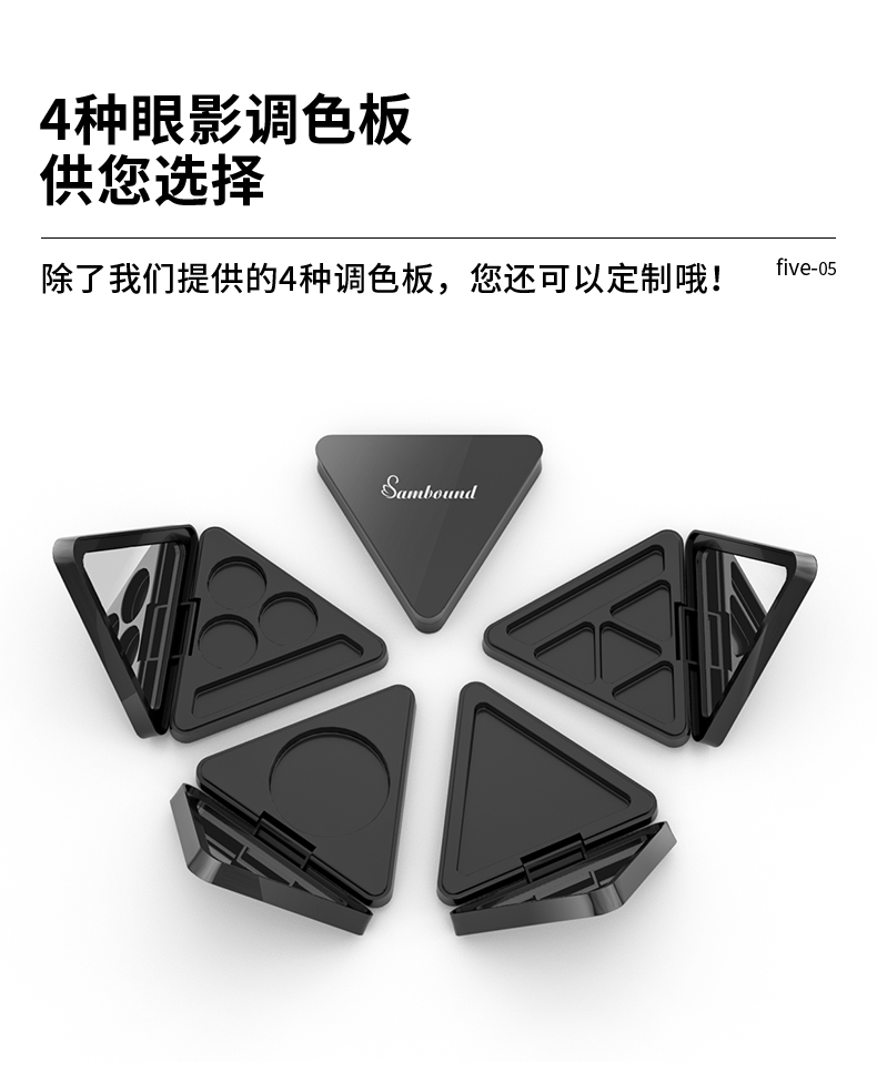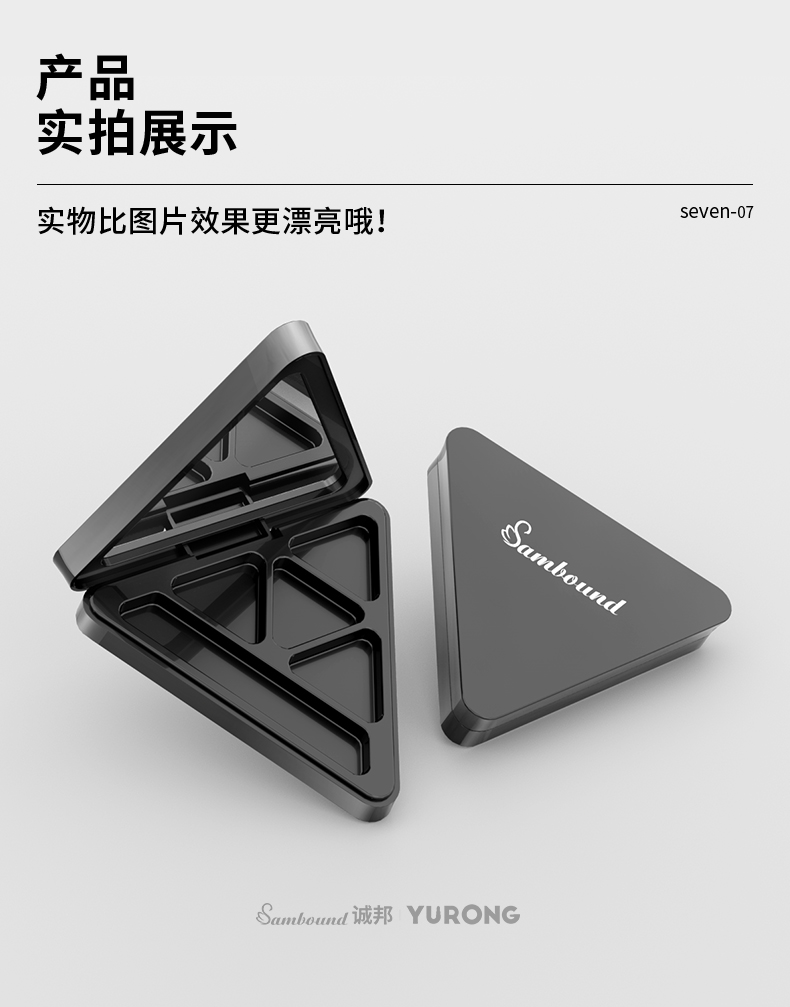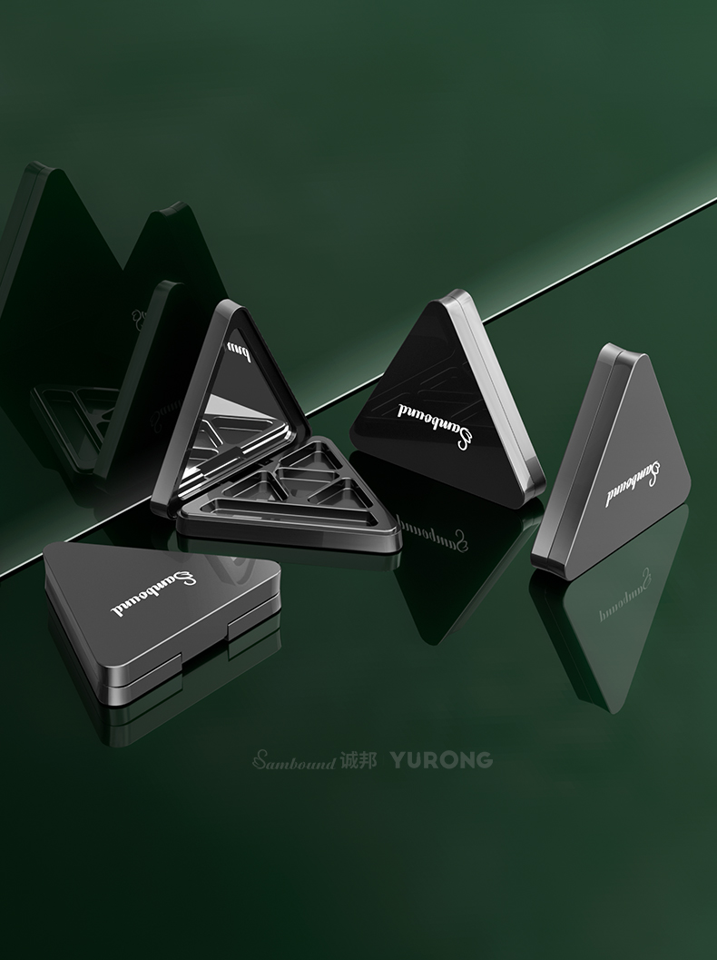 這款空磁吸三角形眼影盤(pán)彩妝包材可定制logo、顏色,有4種內(nèi)格可選,內(nèi)帶高清化妝鏡,磁吸開(kāi)關(guān)更方便,公模加工定制廠家