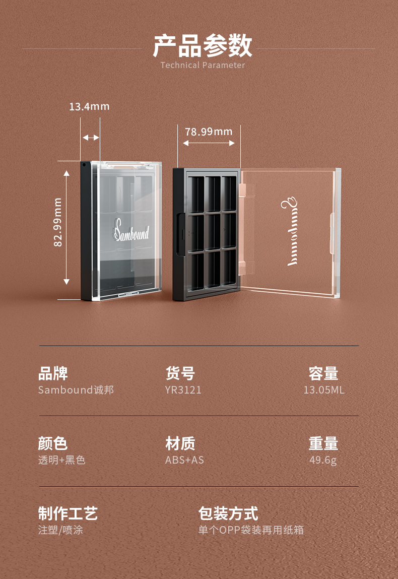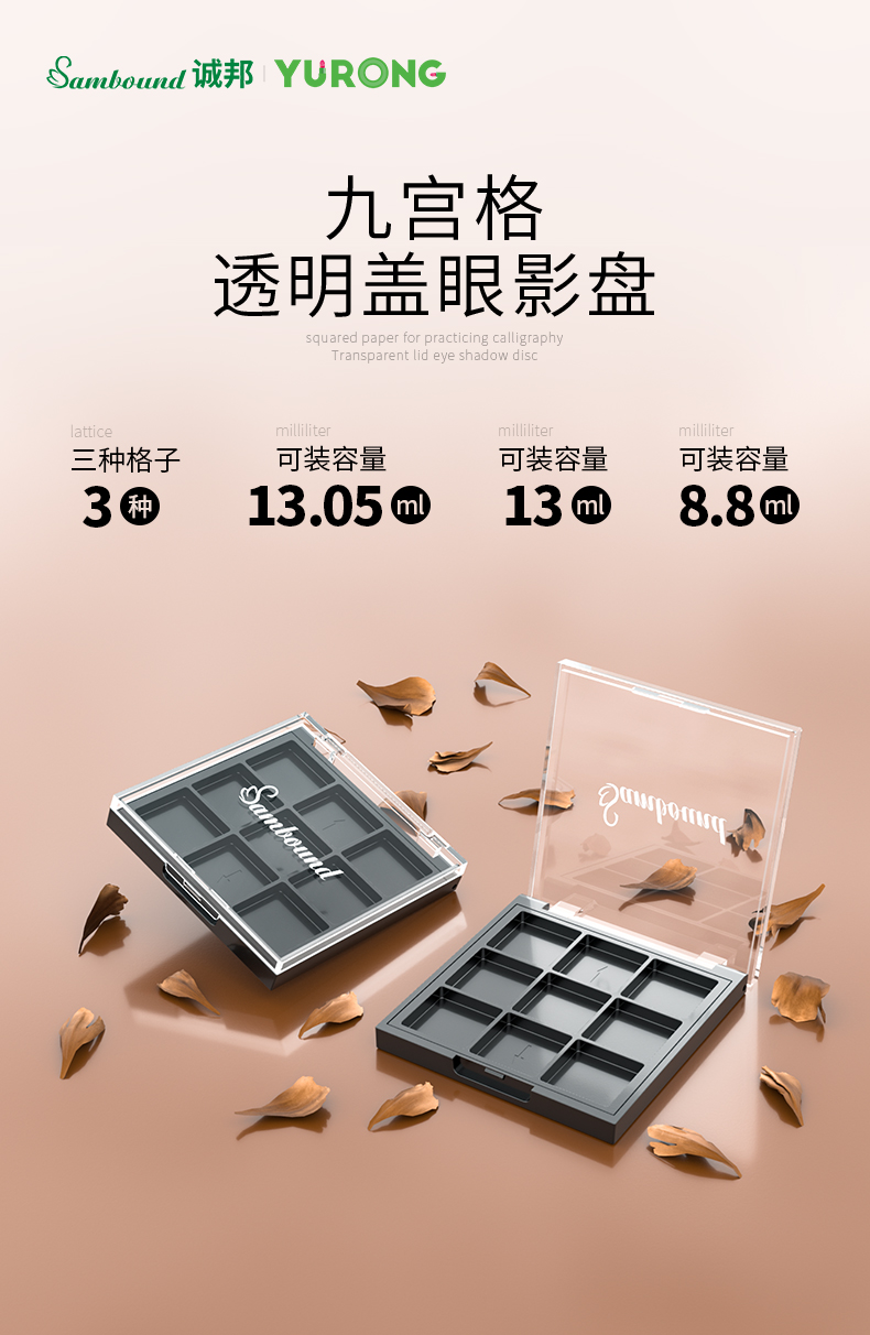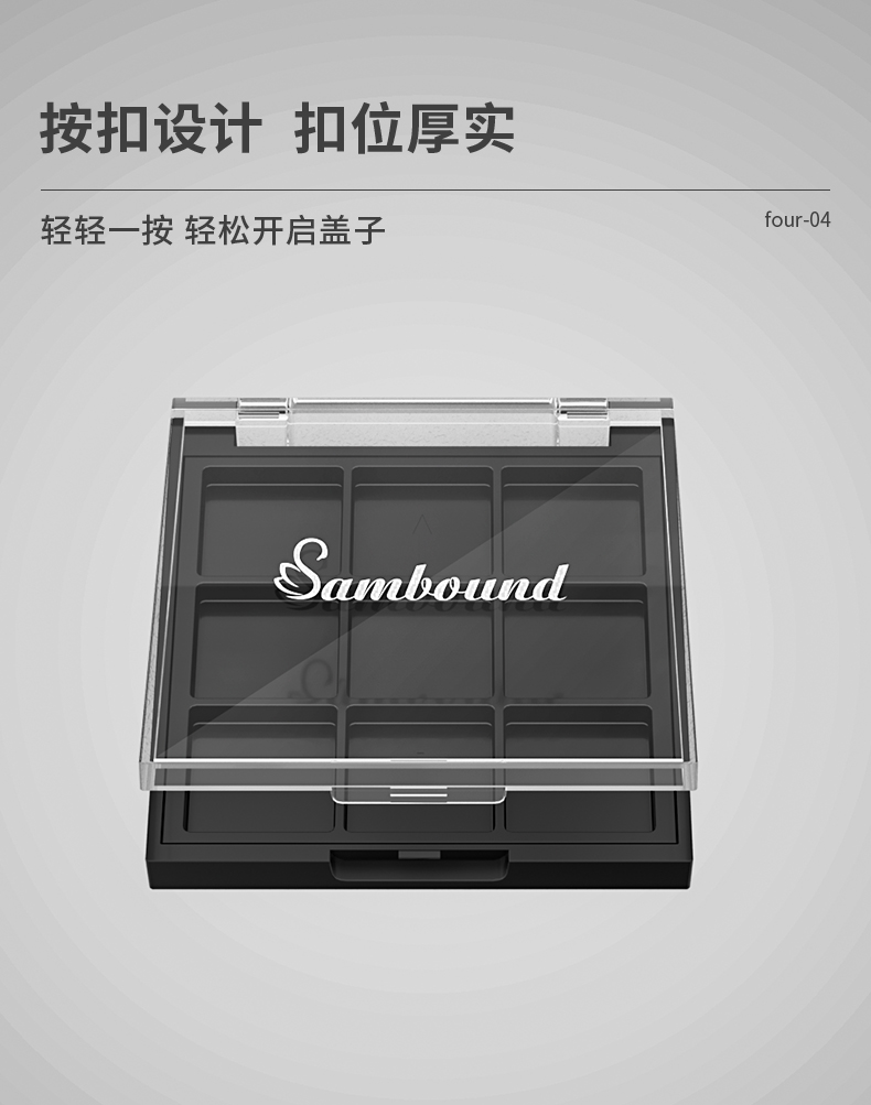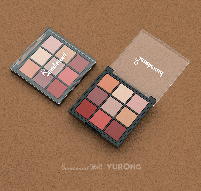 化妝品包裝供應商定制方形透明9色眼影盤包材,該產品特點:透明蓋子、可定制logo、顏色及表面處理,采用按扣開關,公模定制加工生產。