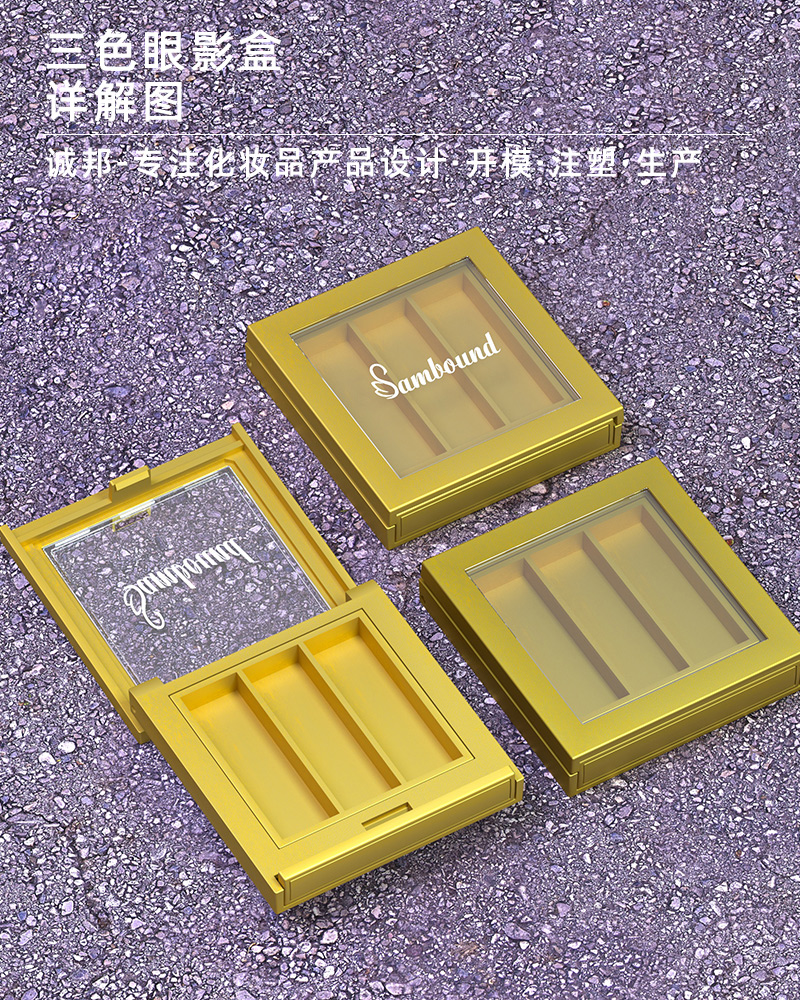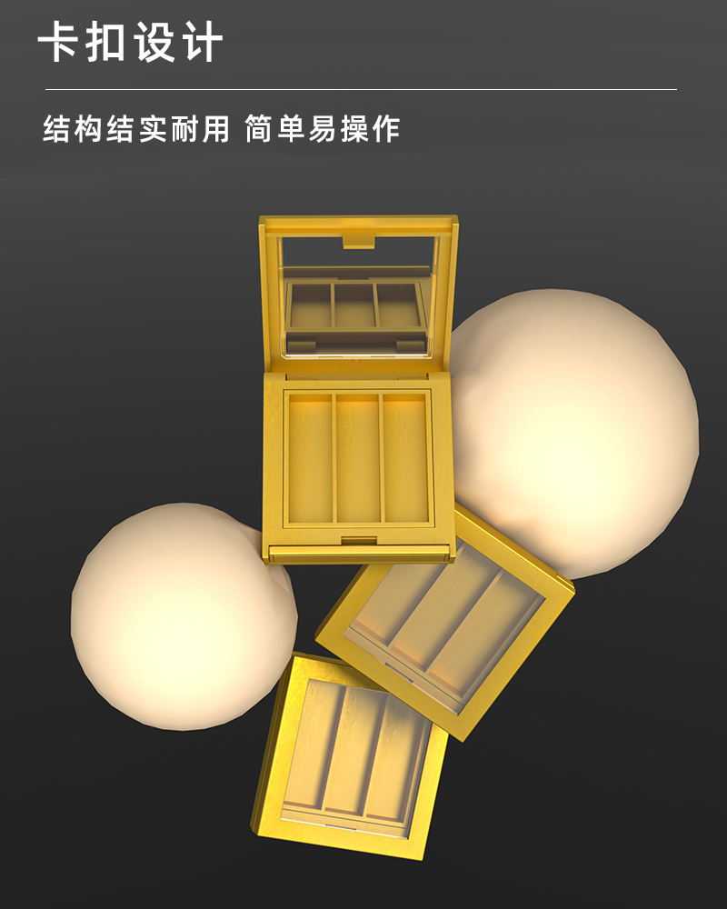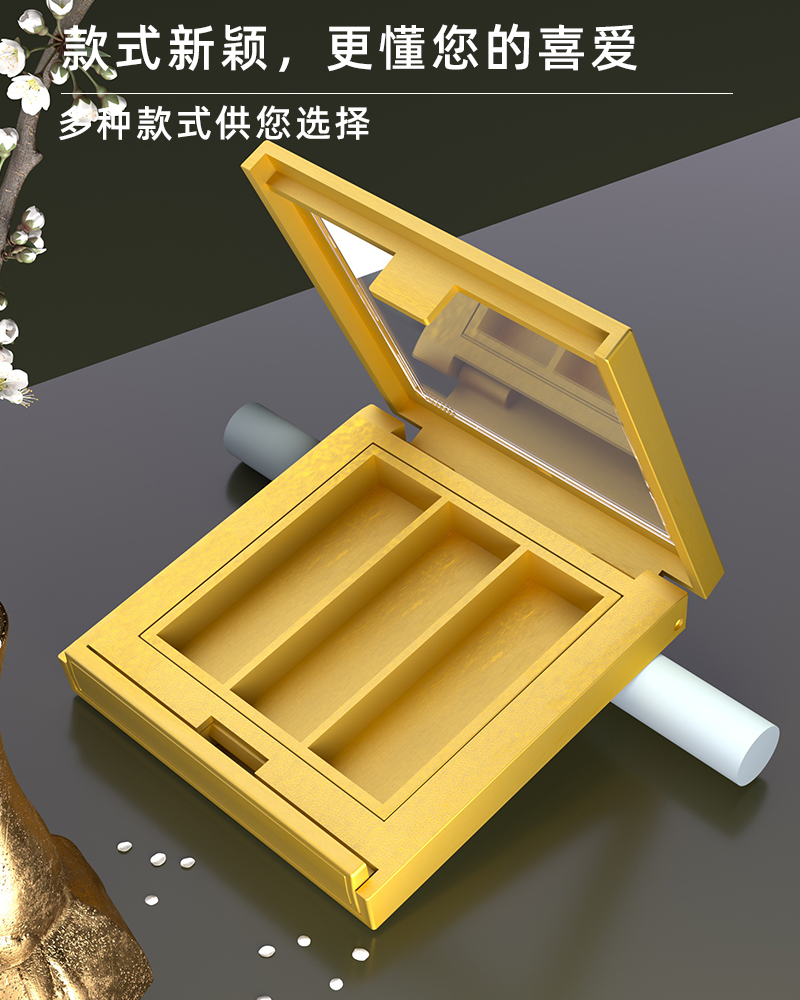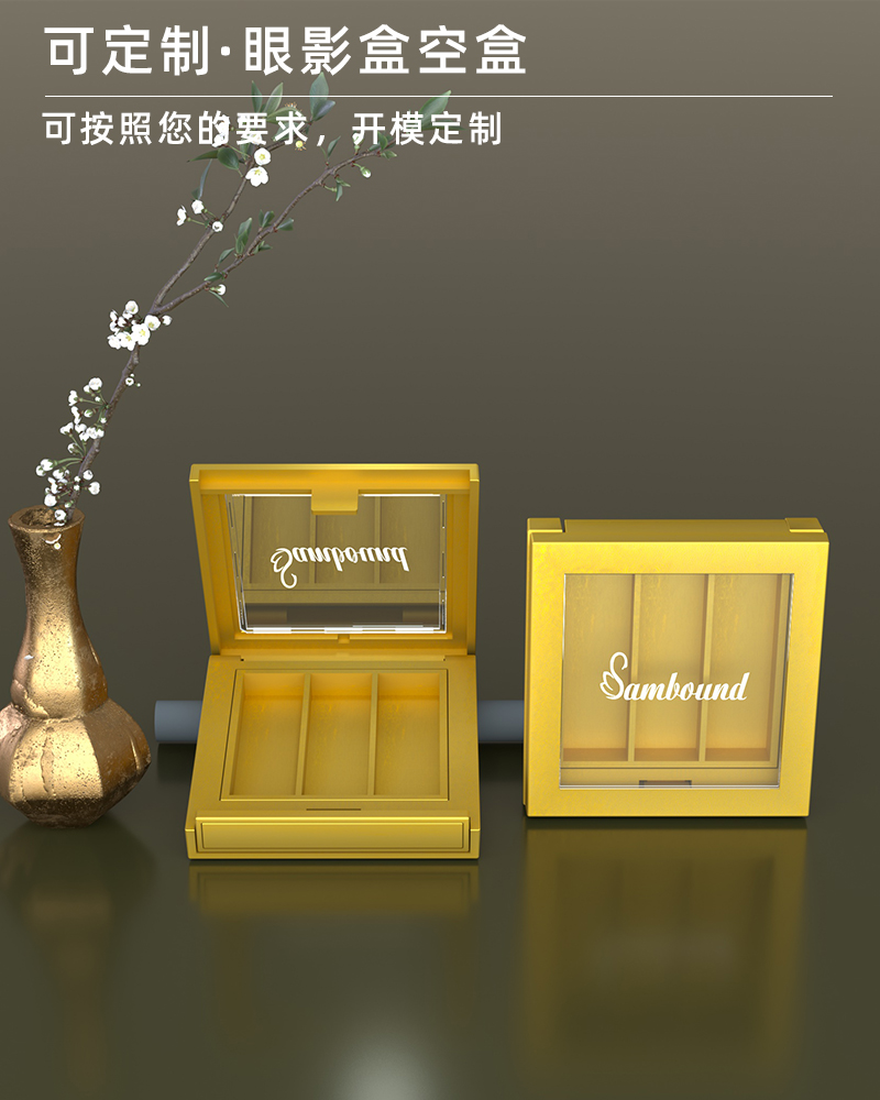 產(chǎn)品名稱眼影盒包材產(chǎn)品貨號YR8009bcc59*63顏色金色-可定制材質(zhì)ABS內(nèi)盒13*43制做工藝注塑 噴油 真空電鍍包裝方式單個OPP袋裝再用紙箱