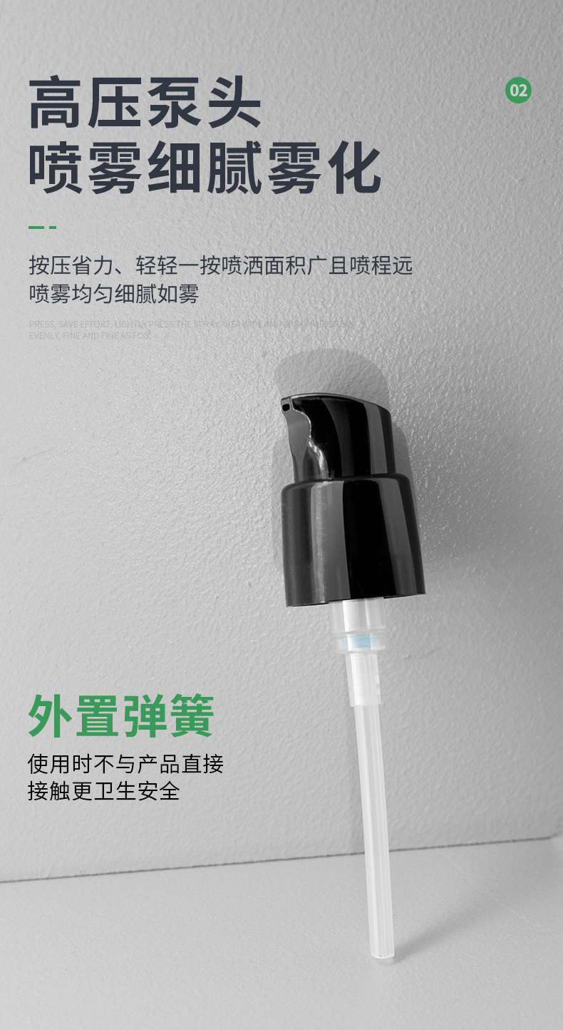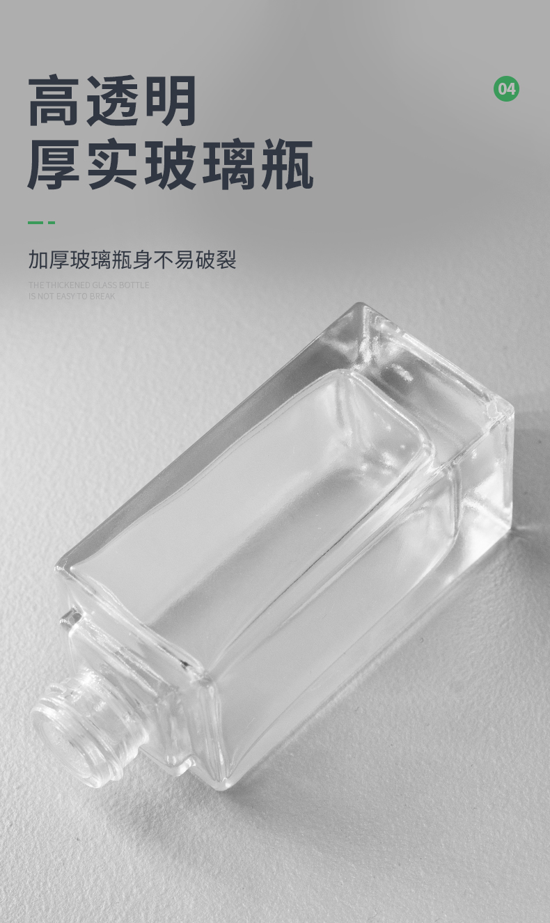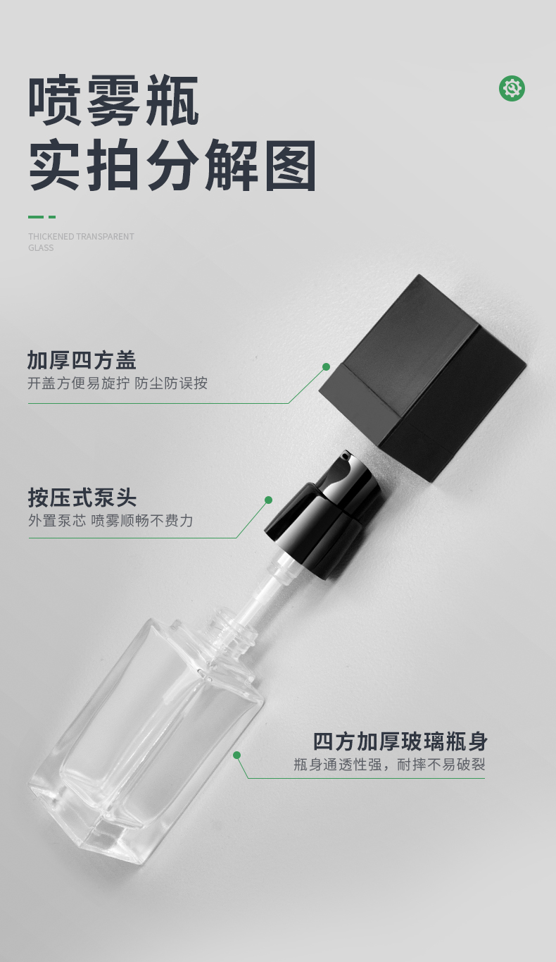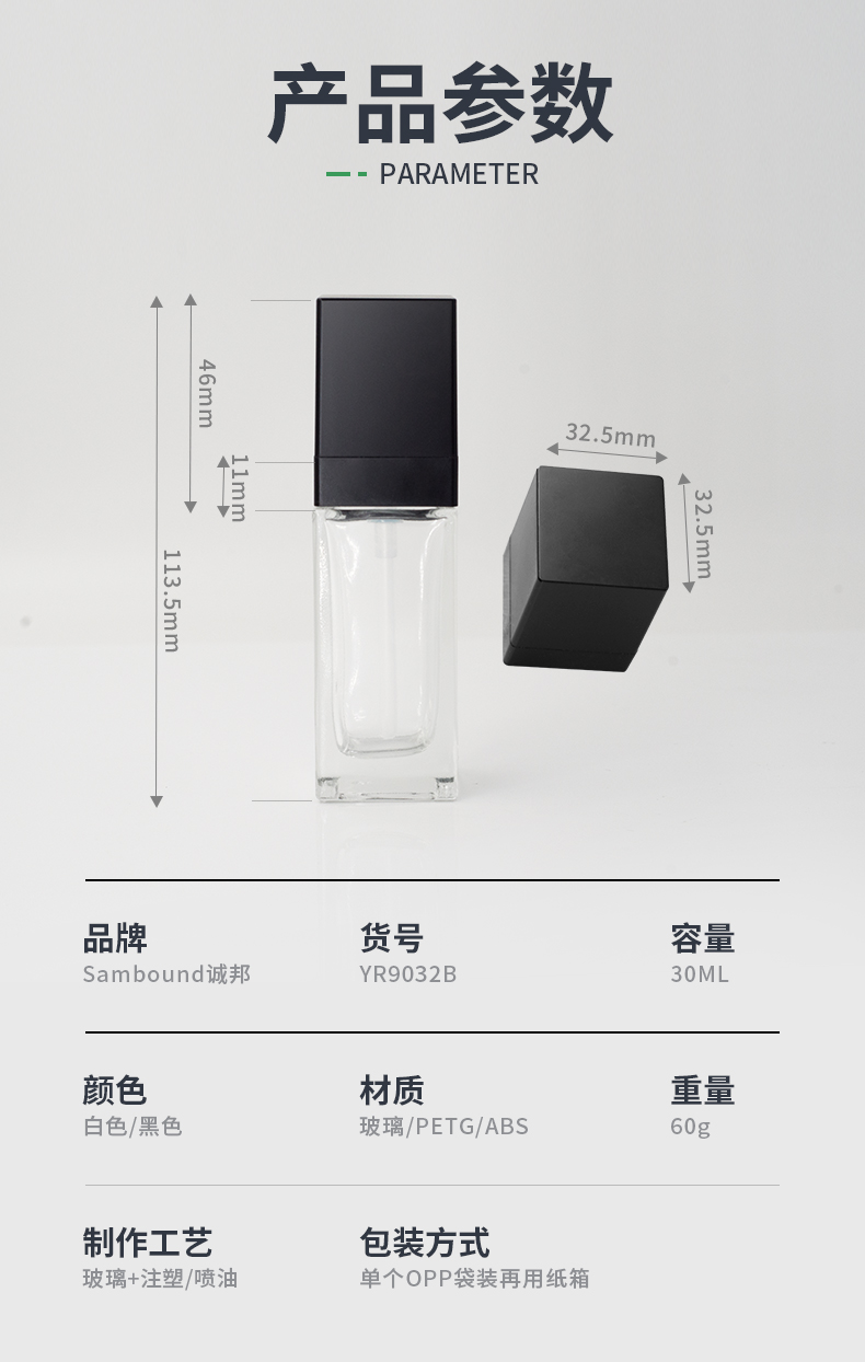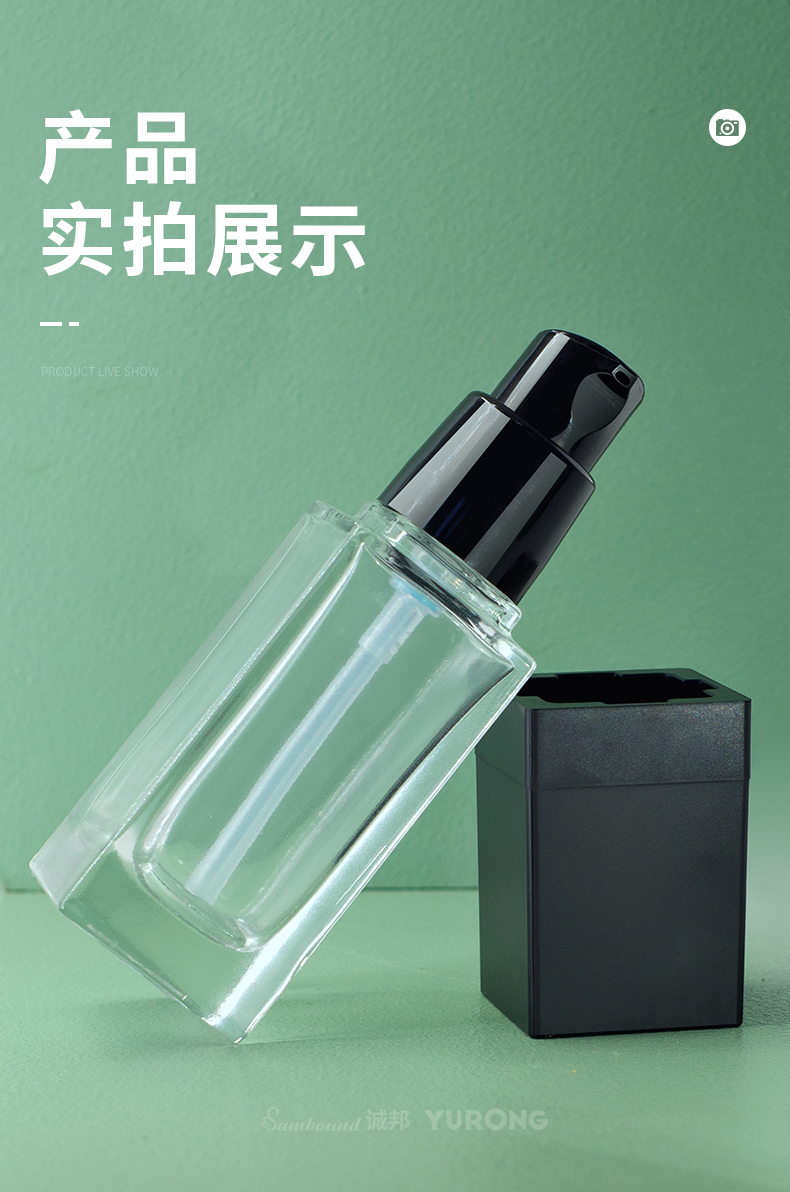 這款香水噴霧玻璃瓶采用ABS加厚蓋,按壓式泵頭設(shè)計,30ml容量,加厚玻璃瓶身,廠家可以定制工藝