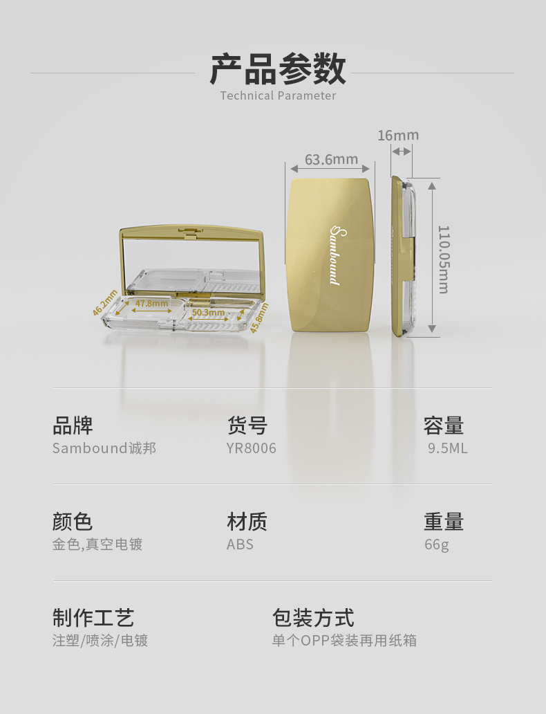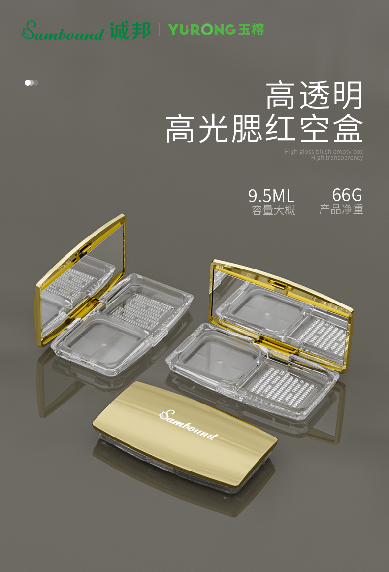 高透明高光腮紅盒,采用ABS和AS料,表面蓋子真空電鍍,也可以按需定制顏色、logo等,東莞誠(chéng)邦化妝品包材是一家成立2010年的彩妝包材注塑價(jià)格廠家,國(guó)內(nèi)外3家分廠。