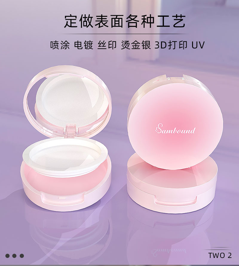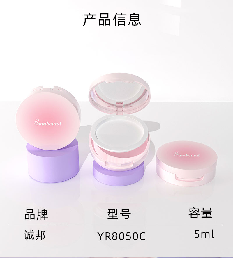 產(chǎn)品名稱粉餅包材產(chǎn)品貨號YR8050C容量5ML顏色粉色-可定制材質(zhì)ABS重量32 9g制做工藝注塑包裝方式單個OPP袋裝再用紙箱